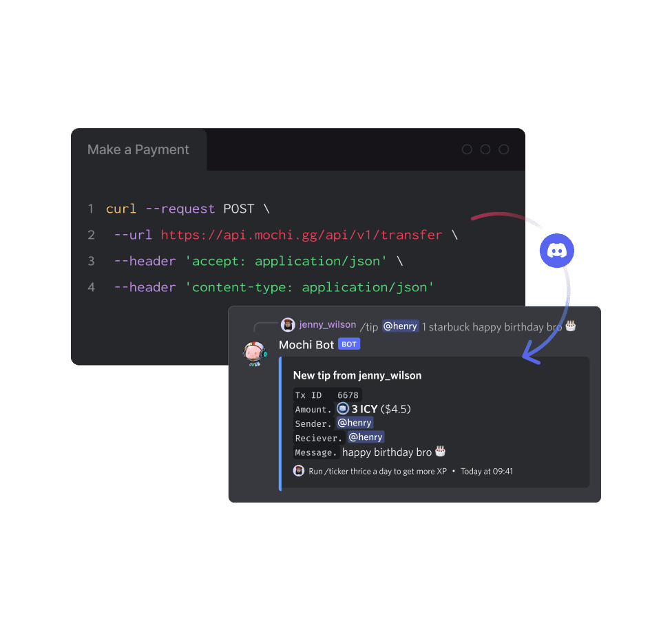 Use Mochi to send and receive any amount of crypto, directly on your favorite Discord servers or Telegram groups, without having a wallet or having to pay a single cent in fees.